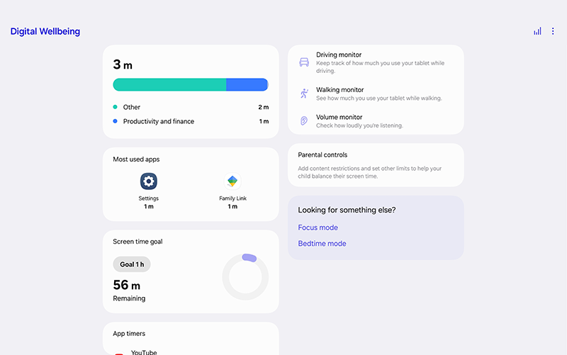Samsung’s Digital Wellbeing & Parental Controls offers a built-in way to manage screen time and see daily usage summaries.