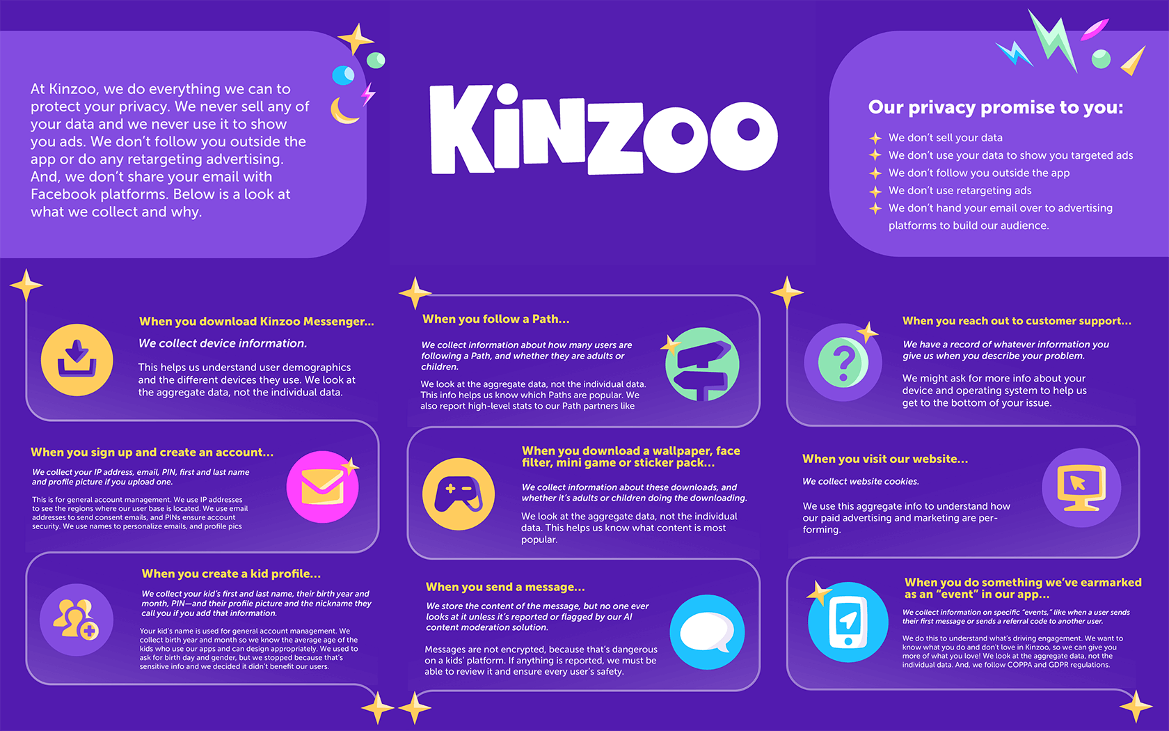 At Kinzoo, we’re on a mission to create better technology for kids and their families, and a big part of that is building platforms that respect and protect your privacy. We only collect the data we need and we take great care to keep your family safe. And because we think transparency is important, we put together this infographic to explain what we collect and how we use it.