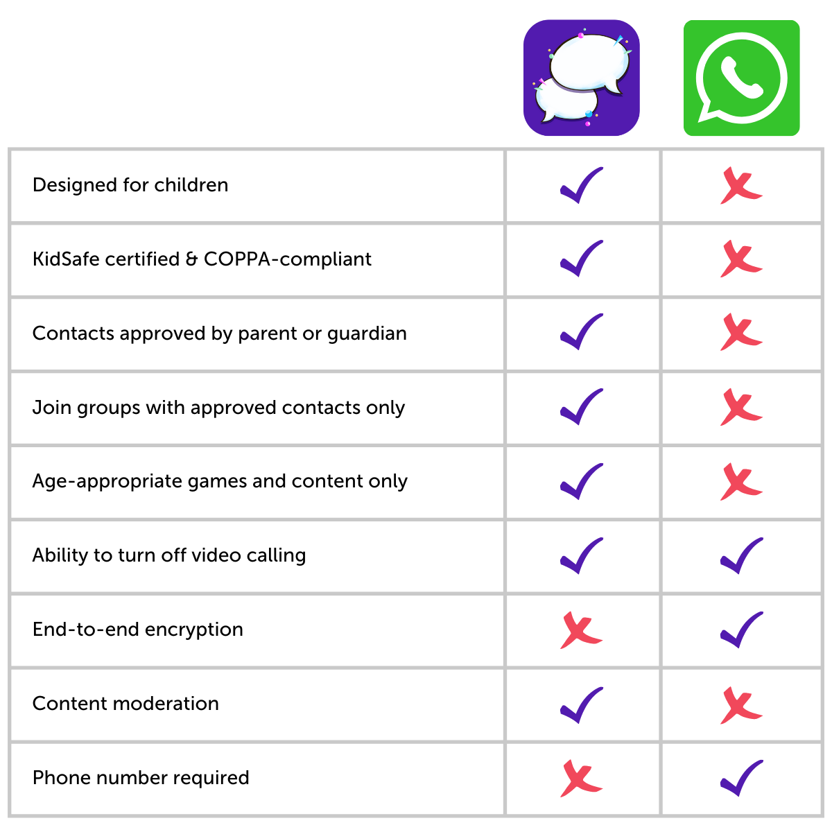 Many adult platforms like WhatsApp also tout the fact that they’re end-to-end encrypted. While this technology certainly has a time and a place, it makes it impossible to moderate a platform, which is essential for safety on a kid-centric messenger. When children are using a platform, end-to-end encryption can be dangerous, because messages can’t be reviewed by anyone but the sender and receiver. It creates the potential for bad actors to hide bad actions, which can be detrimental to children’s safety.