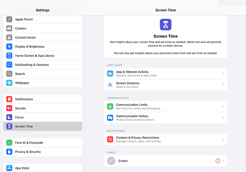 - Screen Distance: Encourage healthy viewing habits by turning on Screen Distance, which reminds your child to hold the iPad at a safe distance from their face.