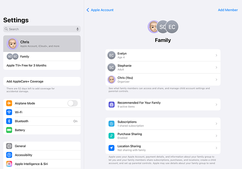 - Add Your Child’s Account: Tap Add Member and create an Apple ID for your child if you haven’t done so already. This ensures you can use tools like Ask to Buy and shared Screen Time controls.